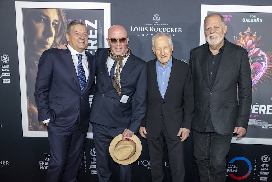 Actresses Karla Sofía Gascón, Zoe Saldaña, Selena Gomez& Netflix co-CEO Ted Sarandos(EMILIA PÉREZ)